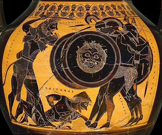 Le premier des douze travaux d'Héraclès est l'un des plus connus, Héraclès dut tuer le lion de Némée au nord de Tyrinthe. La peau du lion est impénétrable, les flèches tirés par Héraclès ne lui infligeaient aucunes blessures, son épée se brisa sur la peau du lion. Finalement, Héraclès étrangla le lion puis s'empara de sa peau pour s'en couvrir et ainsi s'en faire une protection impénétrable.